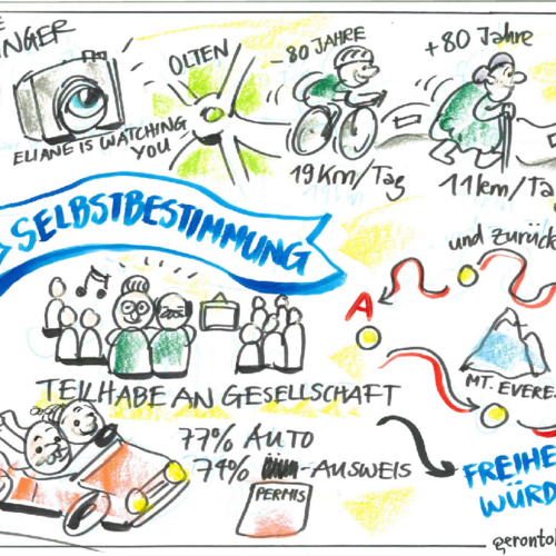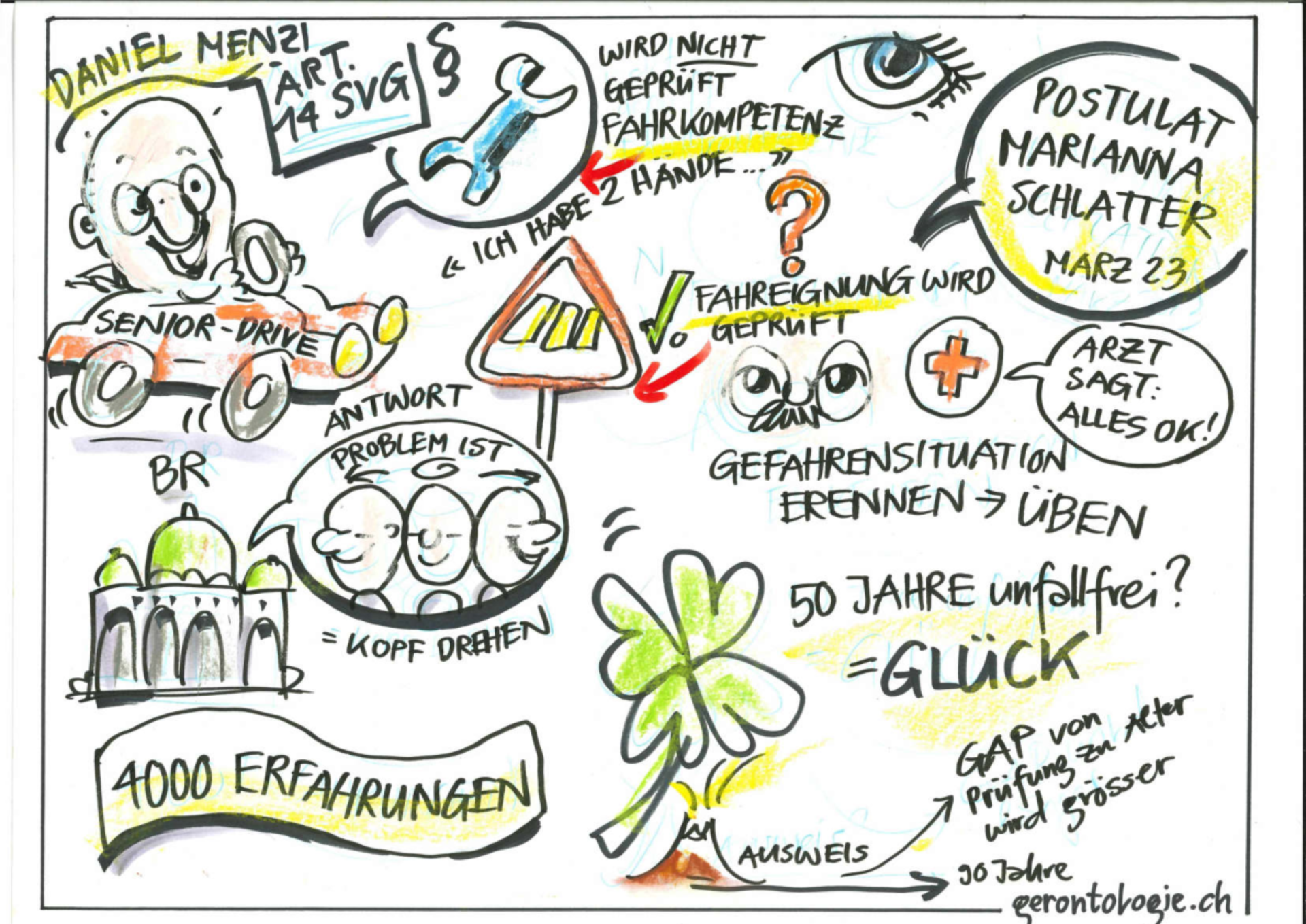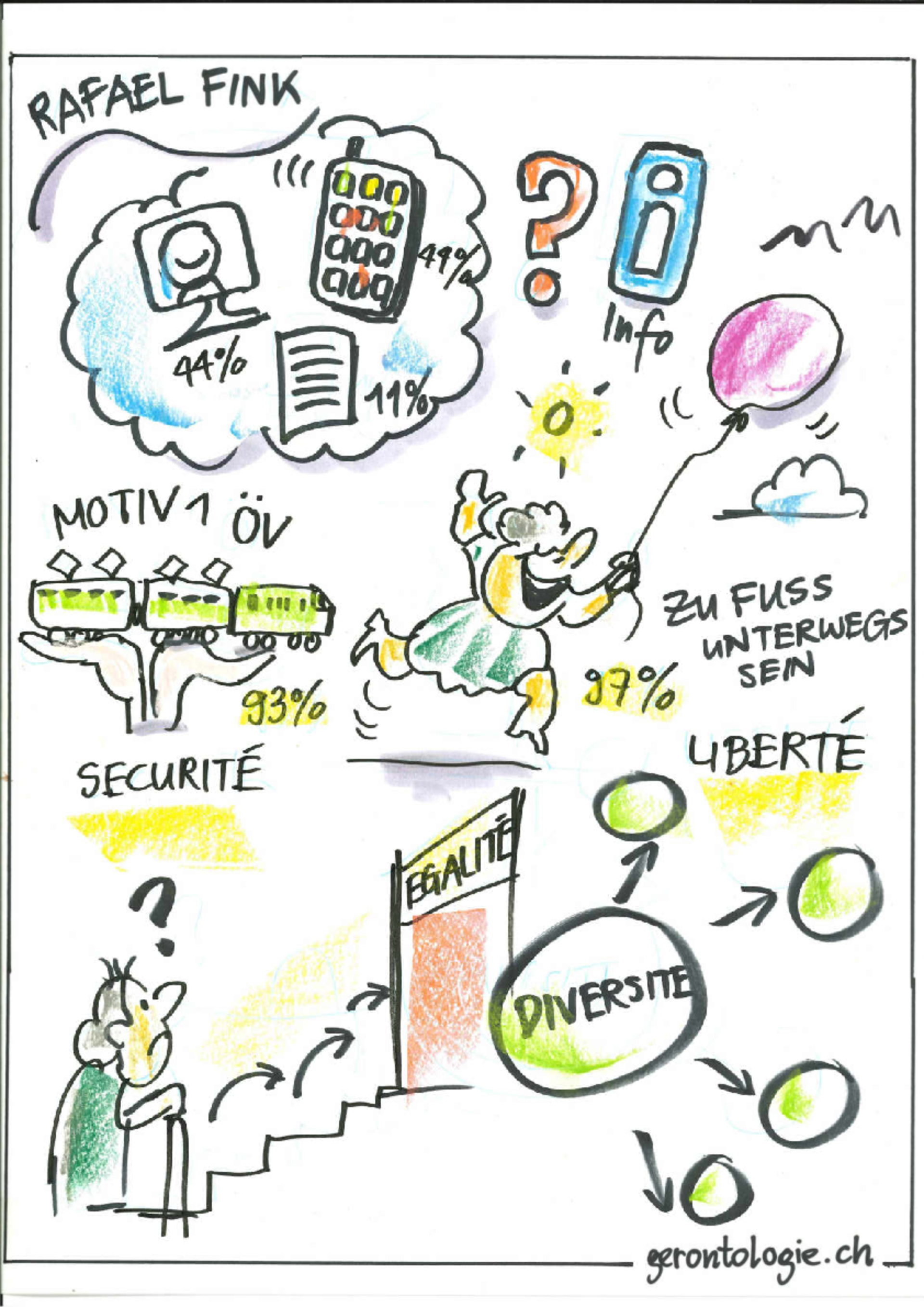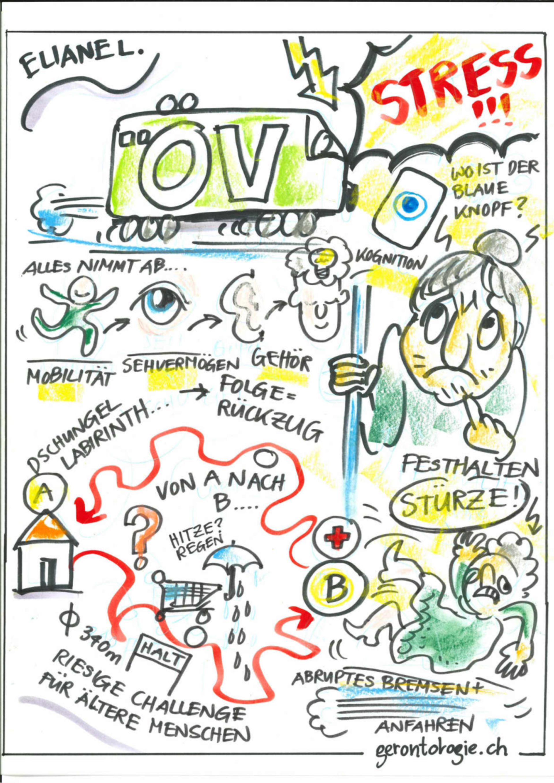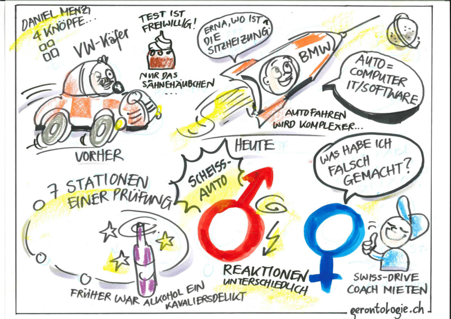 Herzlichen Dank allen, die zum Gelingen der 4. Nationalen Fachtagung GERONTOLOGIE CH «En route - interprofessionelle Ansätze für die Mobilität im Alter» beigetragen haben! Über 100 TeilnehmerInnen waren am 14. September in Olten mit dabei und folgten den spannenden Referaten aus Wissenschaft und Praxis. Erstmals wurde die Tagung cartoonistisch begleitet von Adrian Weber, der die einzelnen Referate im Anschluss treffend «auf den Punkt» brachte. Wir freuen uns, Ihnen untenstehend seine Cartoons zur Verfügung stellen zu können.